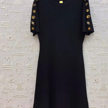 Victoria’s Vouge High Quality Luxury Gold Metal Buttons Short Sleeve Black Knitted Dress Women O-neck A-line Style Elegant Lady Vintage Dresses