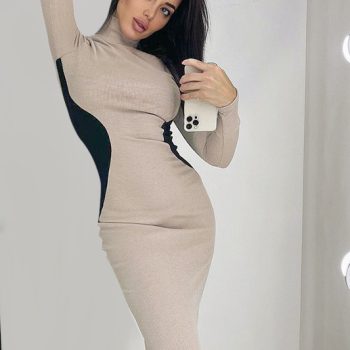 victoria’s vogue High Neck Ankle-Length Dress Long Sleeve Skinny Patchwork Sexy Party Dress Women Casual Bodycon Lady Elegant Dresses