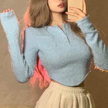 victoria’s vogue Long Sleeve Button Neck Crop Top Solid 2022 Fall Fashion Women Cute Elegant Streetwear Corset Y2K
