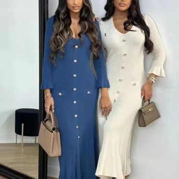 Victoria’s Vogue Elegant Knitted Long Dress Women Flare Sleelve V Neck Ruffles Single Breasted Bodycon Dresses Party Fashion Office Lady Vestidos