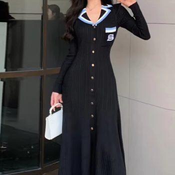 Victoria’s Vogue Fashion Knitted Maxi Dress 2025 Elegant Turn-down Collar Embroidery Long Sleeve Shirt Dress Lady Sweater Vestidos
