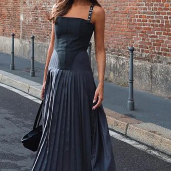Victoria Vogue Female Sexy Grey Patchwork Spaghetti Strap Dress Fashion Sleeveless Pleated A Line Dresses 2023 Autumn Lady High Street Vestidos