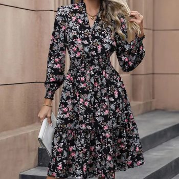 Victoria Vogue Women Autumn Winter Half Sleeve Flower Print Elegant V-neck Casual A-Line Knee-Length High Waist Dress