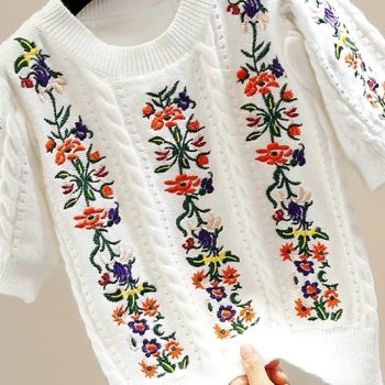 Victoria’s Vogue Vintage Elegant Embroidered Knitted Sweater Tshirt Women Summer Puff Sleeve O-neck Tops Pullovers Stylish Fashion Chic Knitwear