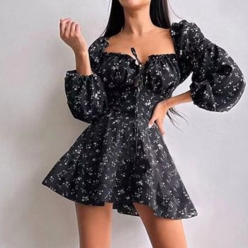 Victoria’s Vogue Long Puff Sleeve Floral Dress Wmen Autumn Winter Square Collar Backless Dress Female Fashion Elegant Dresses New
