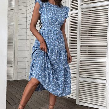 Victoria’s Vogue Summer Retro Women’s O Neck Sleeveless Midi High Waist Blue Floral A Line Chic Long Dress For Fashion
