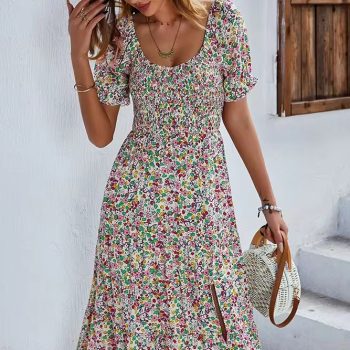 Victoria’s vogue Bohemia Print Dress Women 2024 New Summer Holiday Midi Dress Casual Puff Sleeve High Waist Boho Split Dresses For Women Clothes