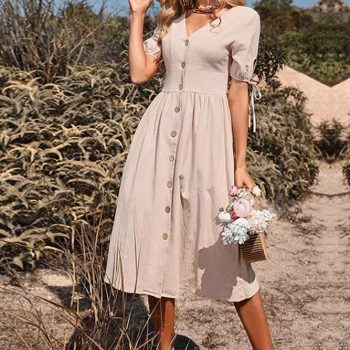 Victoria’s Vogue Summer Women’s Short Sleeve V Neck Solid Color Single Breasted Cotton Linen A Line Causal Dress