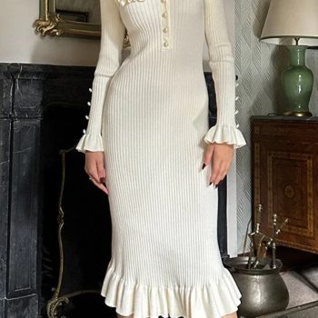 victoria’s Vogue High Waist Ruffled Maxi Dresses For Women Autumn Winter Knitted Slim Long Dress Women’s Vintage Dress Woman Retro Elegant
