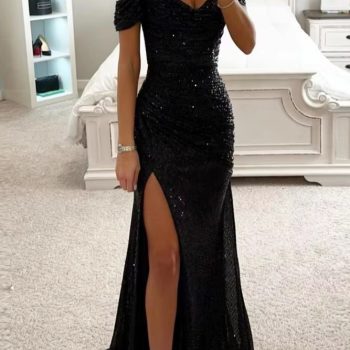 victoria’svogue 2025 Elegant Off-shoulder Gown Dress V-Neck Sequin Pleated Short Sleeve Waist Tight Maxi Dress Split Evening Party Prom Dress