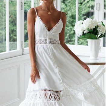 Victorias Vogue 2021 Sexy Hollow Out Lace Spaghetti Strap White Summer Beach Dress Robe Elegant Women Beachwear Maxi Dress Vestidos