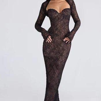 Victoria’s Vogue Lace Long Sleeve Sexy Maxi Dress Women Elegant Square Collar Strapless Backless Split Bodycon Club Party Long Dress