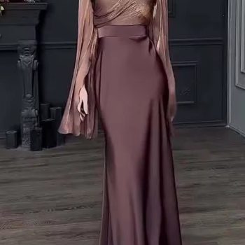 Victoria’s Vogue Vintage High Waisted Women Satin Long Dress New Ladies Temperament Crew Collar Dresses Elegant Slim Long Sleeve Banquet Dress