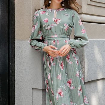 victoria’s vogue Elegant floral print long dress women round neck long sleeve ruffled holiday dress middle waist autumn winter dresses