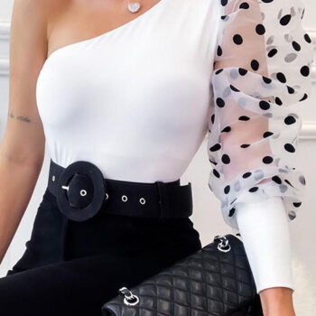 victoria’s vogue Puff Sleeve Patchwork Dot Print Women Blouse Elegant Sexy One-Sleeve Skew Neck Off Shoulder Slim Fashion Spring New