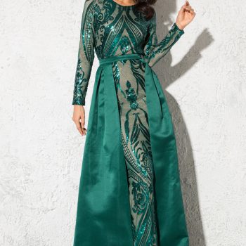 victoria’svogue 2021 Green Sequined O Neck Full Sleeved Evening Party Dress Stretchy Floor Length Ball Gown with Detachable Train Burgundy