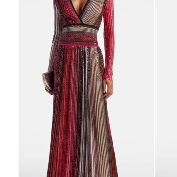 Victoria’s Vogue Women V-Neck Metallic Sequined Embellished Striped Waist Pleated Knitted Long Dress