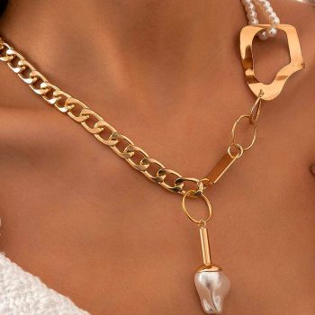 victoria’s vogue Steampunk Irregular Iron Sheet Link Chain Choker Necklace Baroque Imitation Pearl Pendant Necklace for Women Jewelry