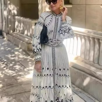 Victoria’s Vogue Ladies Elegant Printed Midi Dress With Belt Fashion Stand Collar Long Sleeve A-line Dresses Spring Female Casual Street Vestidos