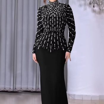 Victoria’s Vogue Elegant Party Diamond Pearl Long Bodycon Dress Women O Neck Long Sleeve Glitter Club Evening Black Sheath Maxi Dress