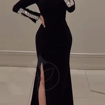 Victoria’s Vogue Women Elegant Solid High Slit Party Dress Temperament Long Sleeve Slim Evening Gala Dress Turtleneck Rhinestone Banquet Dresses