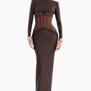 Victoria’s Vogue Luxury Sheer Corset Brown Long Dresses for Women – Long Sleeve High Neck See Through Bodycon Maxi Dress with Mesh Waist Detail