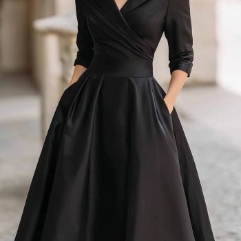 Victoria’s Vogue Women Elegant Wedding Guest Dress Turndown Collar Mid-Length Waisted A-Line Evening Dress Cocktail Party Satin Midi Dresses