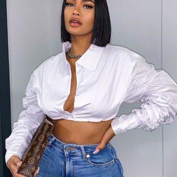 victoria’s vogue 2022 Long Puff Sleeve Solid Botton Ruched Patchwork Tshirt Top Autumn Winter Women Fashion Sexy Party Club Outfits