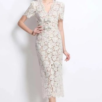 Victoria’s Vogue Crystal Bow Evening Formal Dress Women Summer Elegant Short Sleeve Hollow Out Pearl Embroidery Midi Long Lace Dresses