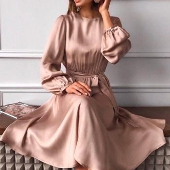 victoria’s vogue Office Lady Satin Bandage Straight Dress Women Lantern Sleeve o Neck Midi Dress 2021 Elegant Female Comfort Fashionic6t