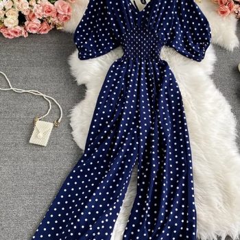 Victoria Vogue V Neck Sexy Dolman Sleeves Waist Slim Polka Dot Print Jumpsuit Women Wide Leg Trousers Jumpsuit