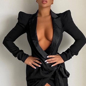 victoria’s vogue Women Fall Fashion Bodycon Solid Long Sleeve With Shoulder Pads Revealing String Belt Mini Dress 2022 Streetwear Y2K