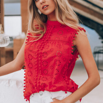 victoria’s vogue Elegant tank top women blouse Cotton embroidery red shirts feminina sexy top Stand neck tassel pompon ladies tops female