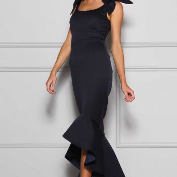 victoria’svogue 2021 Bow Shoulder Backless Black Elegant Ruffled Fishtail Style Midi Summer Dress Sleeveless Stretch Evening Party Night Club Dress