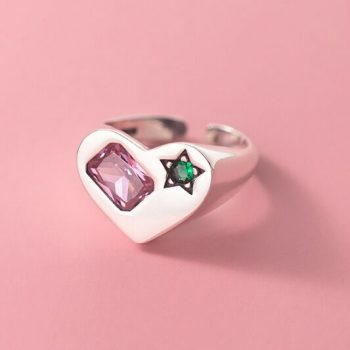 victoria’s vogue New Fashion Pink Diamond Love Simple Green Satr 925 Sterling Silver Jewelry Heart Shaped Geometric Opening Rings