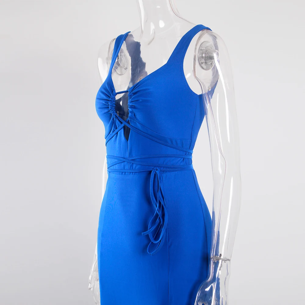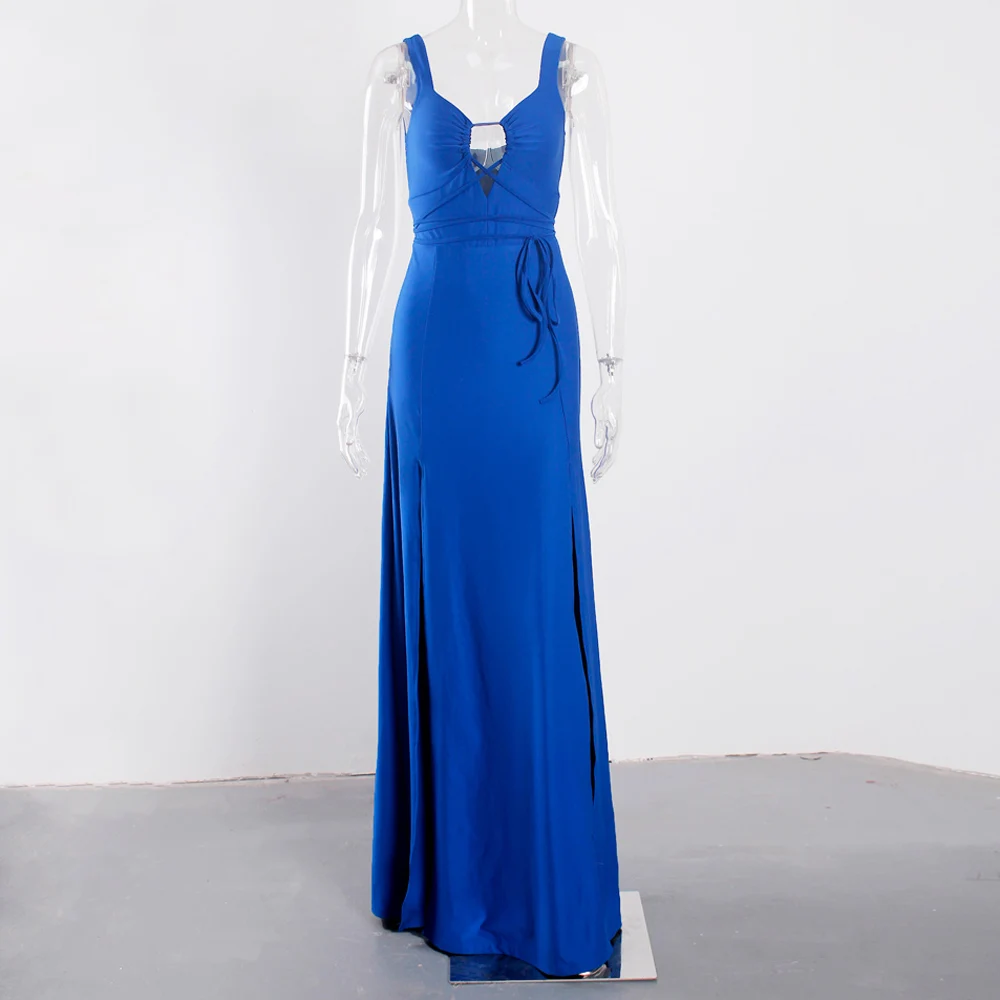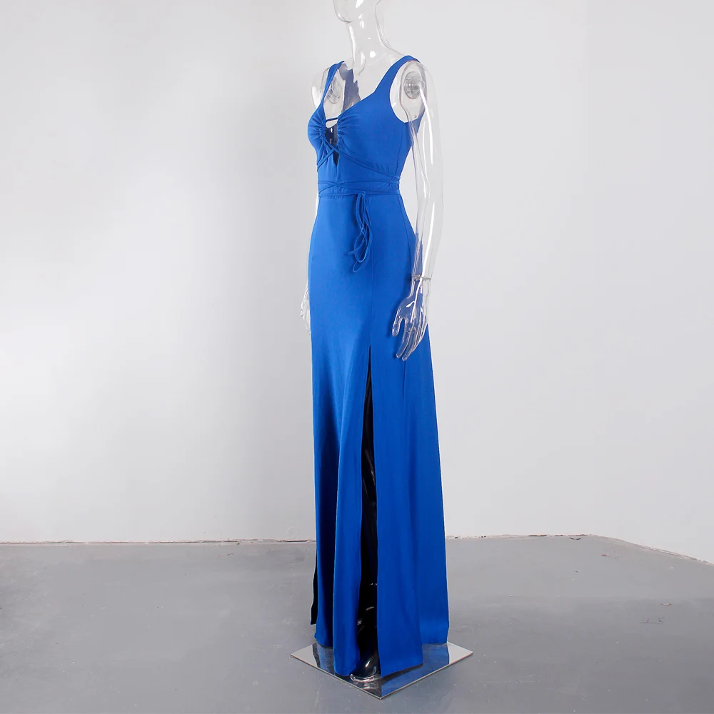 victoria’svogue 2021 Sexy Blue Sleeveless Long Summer Dress Double Splits Lace Up Hollow Out Backless Stratch