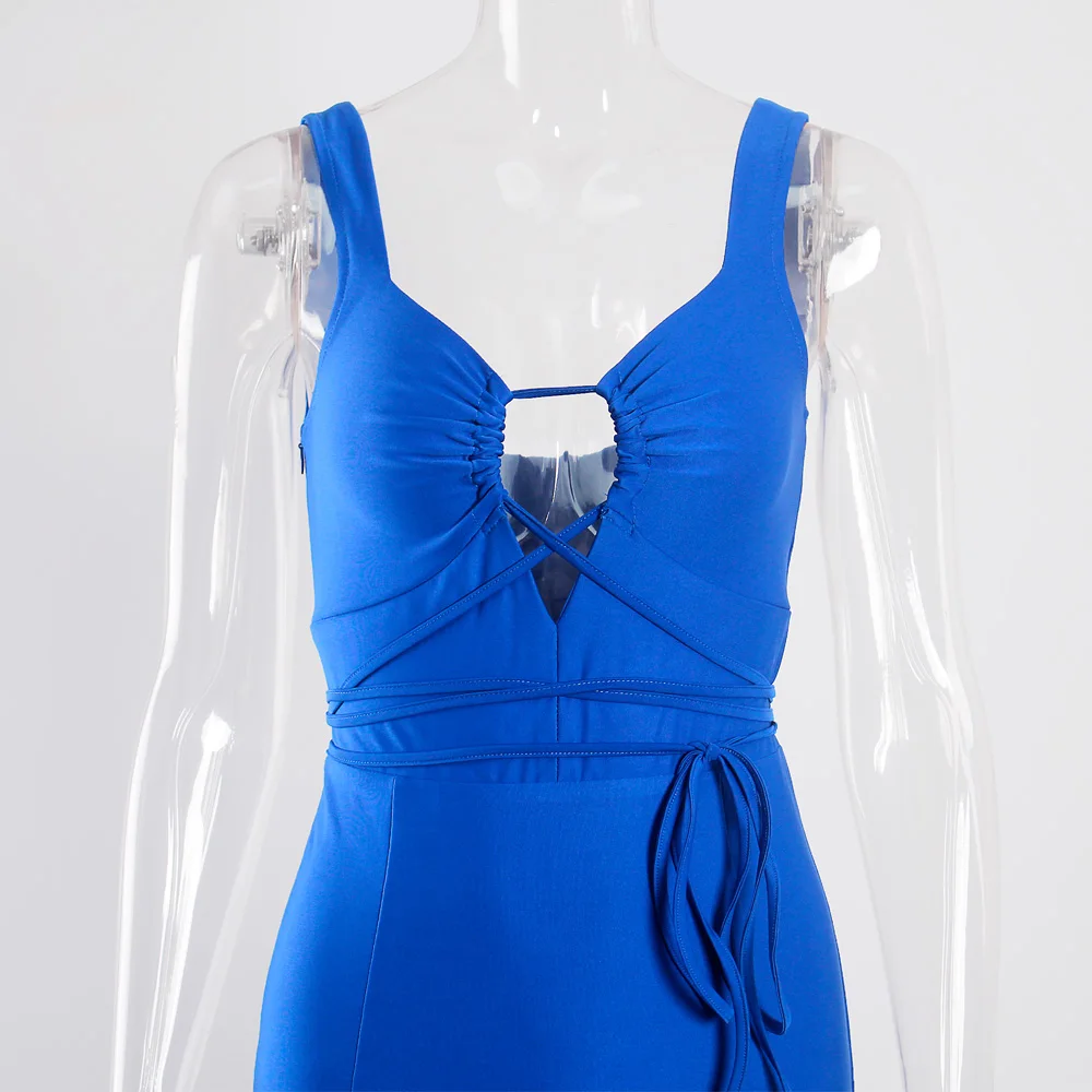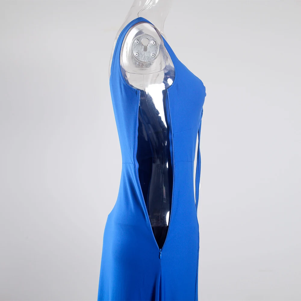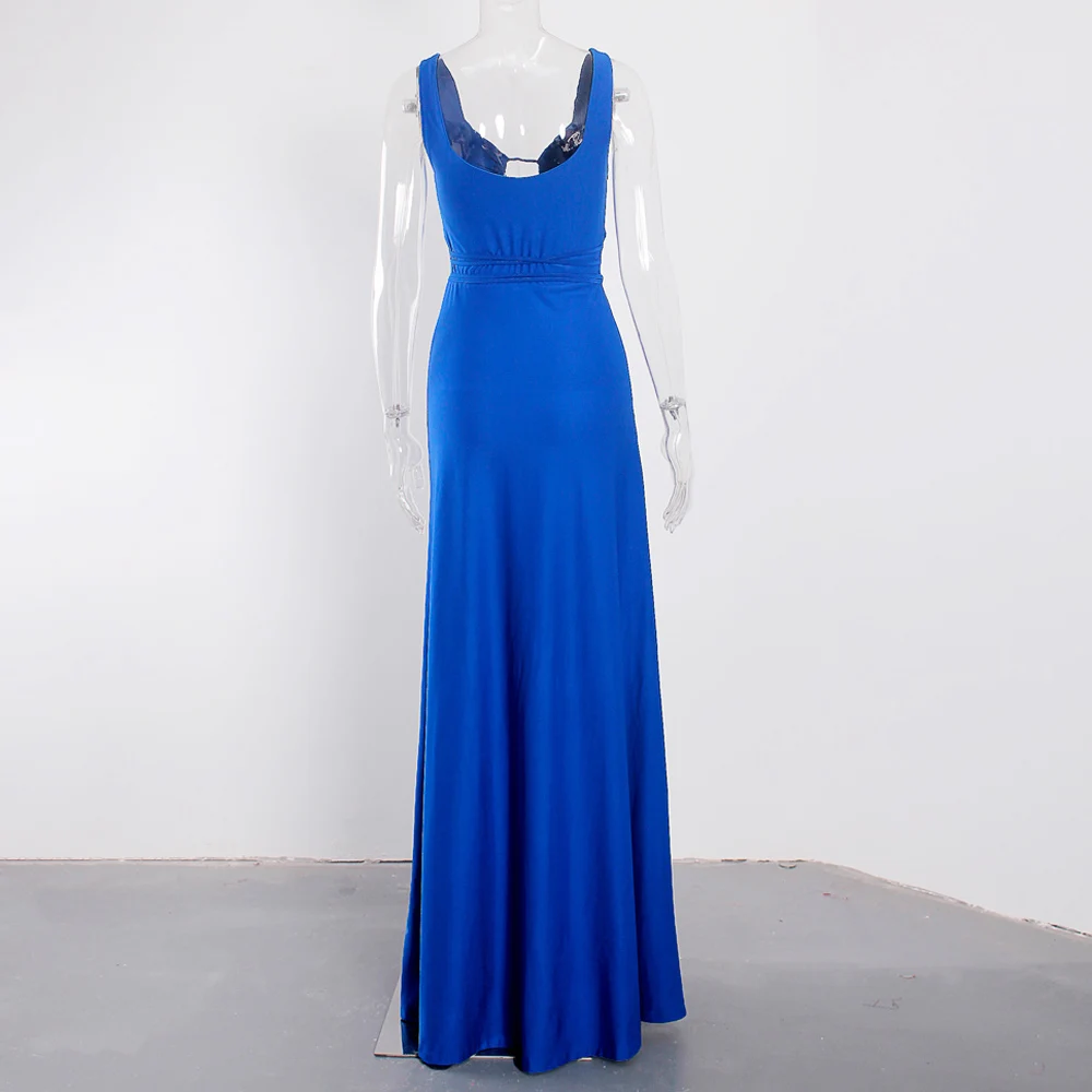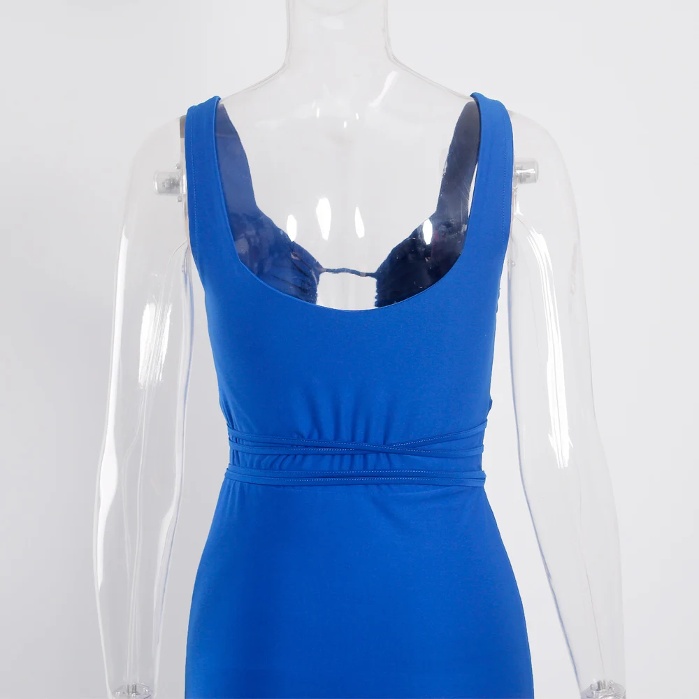 victoria’svogue 2021 Sexy Blue Sleeveless Long Summer Dress Double Splits Lace Up Hollow Out Backless Stratch