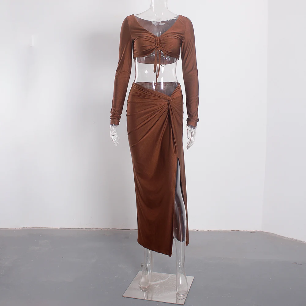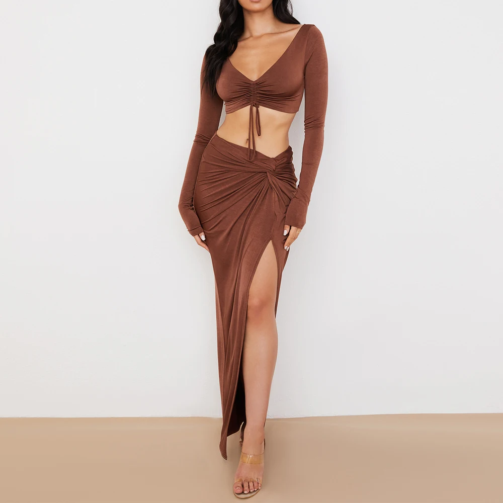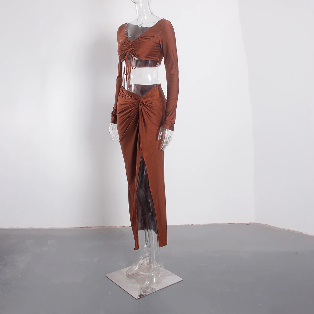 victoria’svogue 2021 Sexy Bodycon Women’s Set Drawstring Ruched Split Full Sleeved Crop Tops Night Club Party Wear