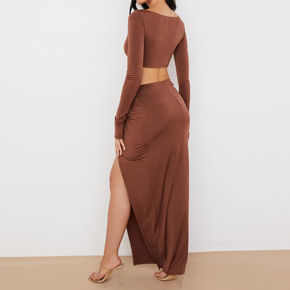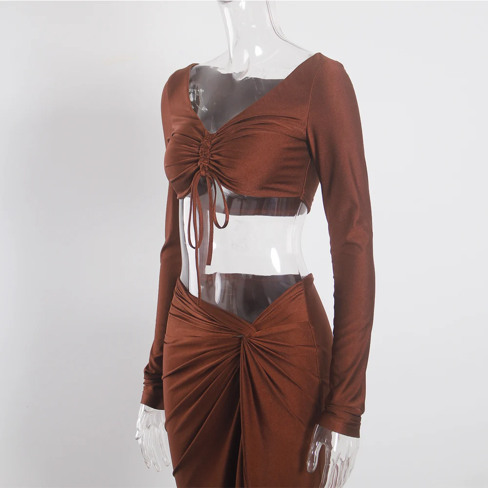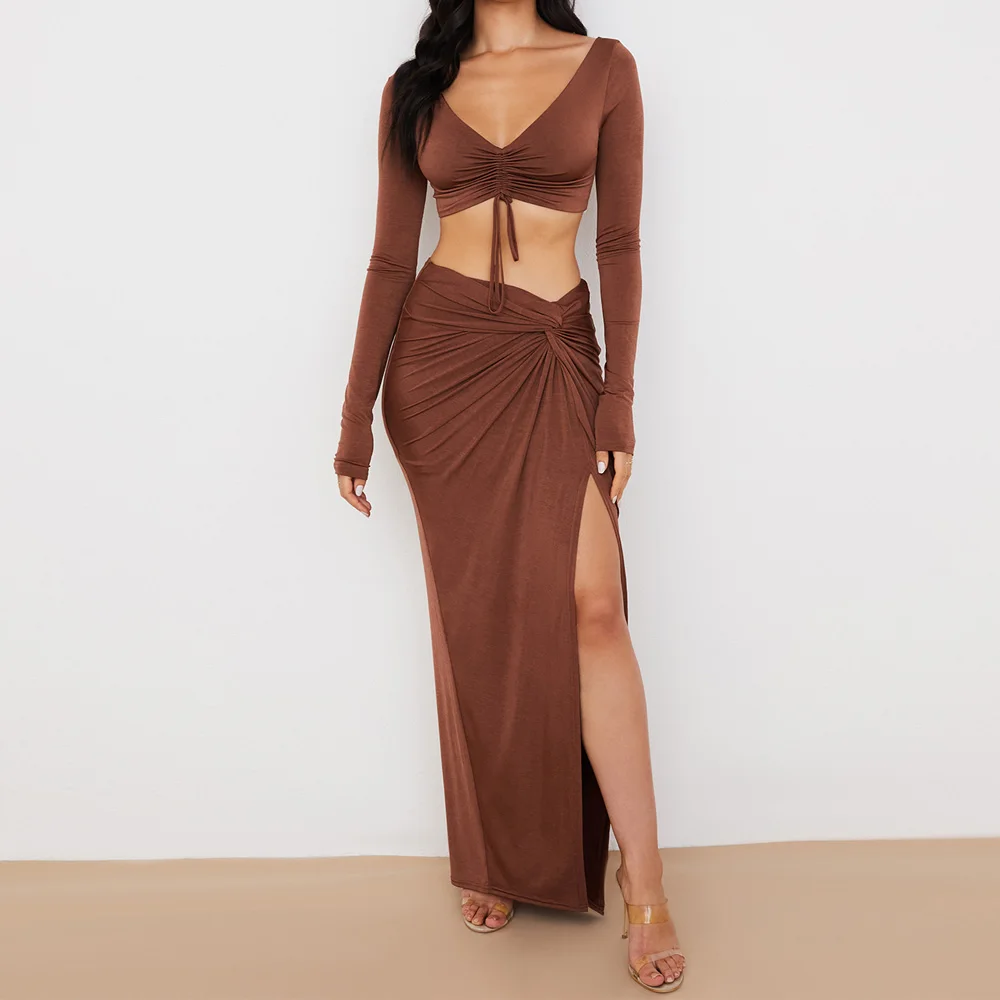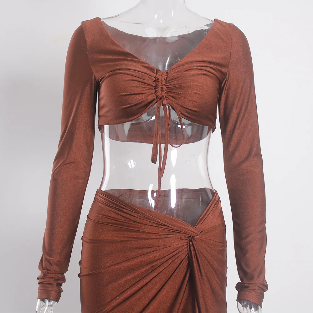 victoria’svogue 2021 Sexy Bodycon Women’s Set Drawstring Ruched Split Full Sleeved Crop Tops Night Club Party Wear