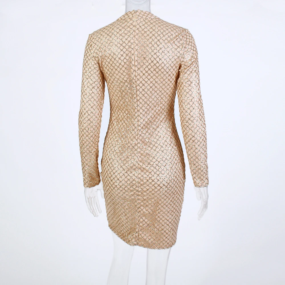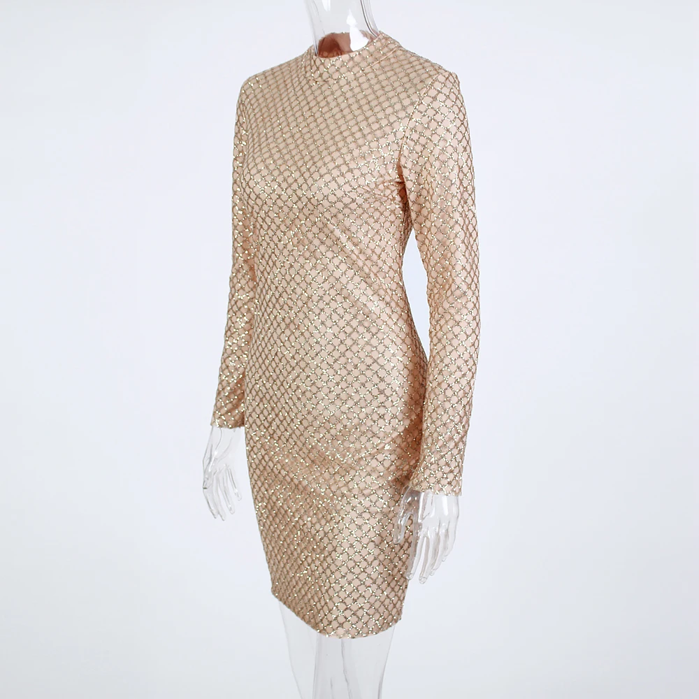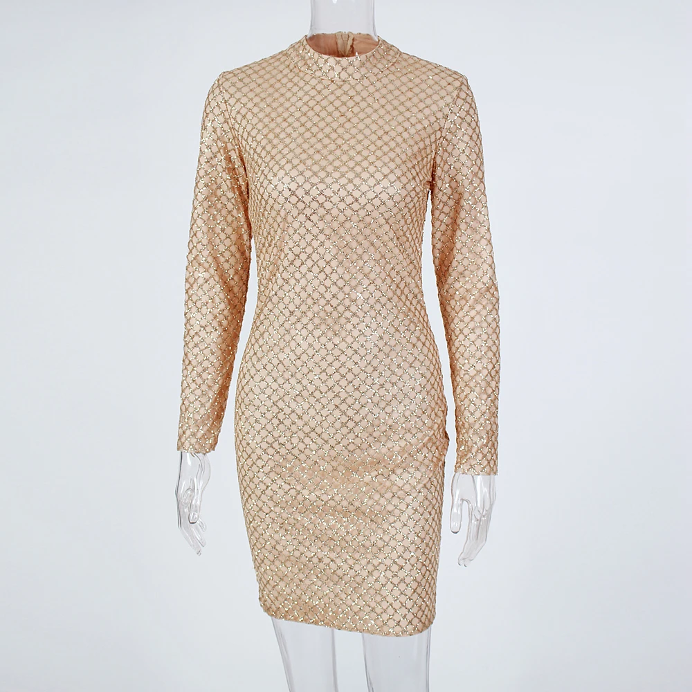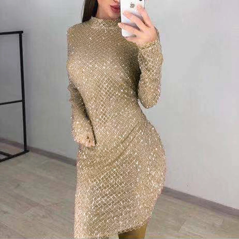 victoria’svogue 2021 Sexy Glittered Bodycon Party Mini Dress Full Sleeved Short Gold Plaid Glitters Dress O Neck Night Club Dress Spring