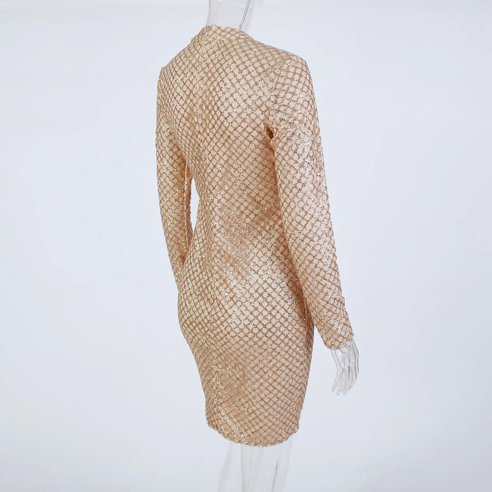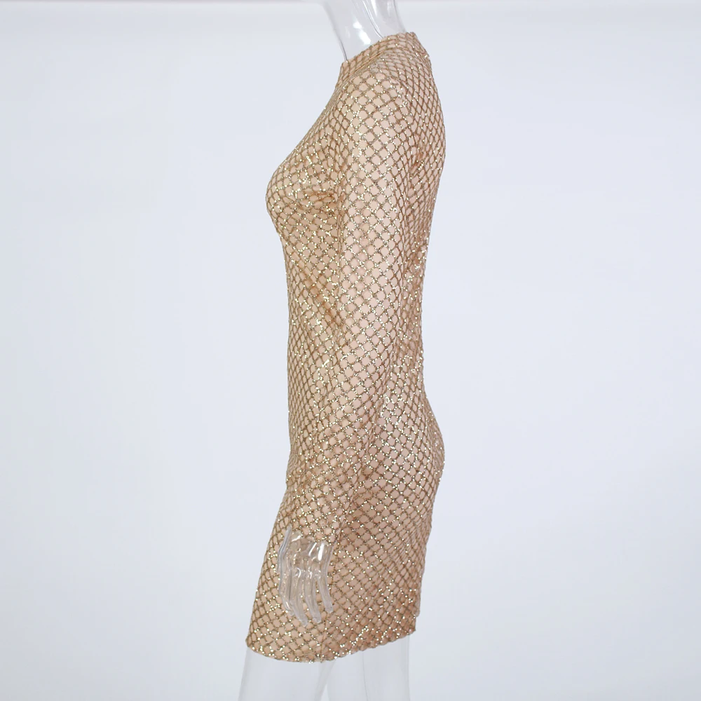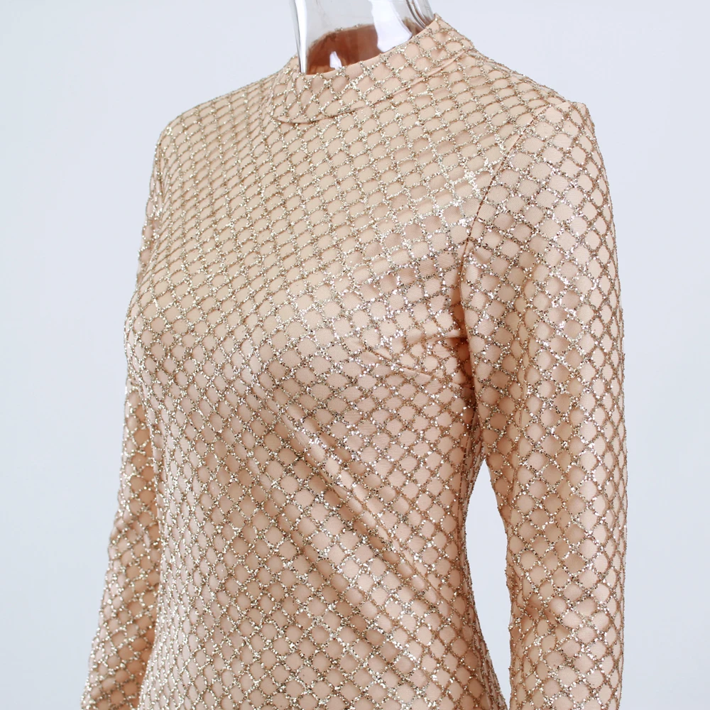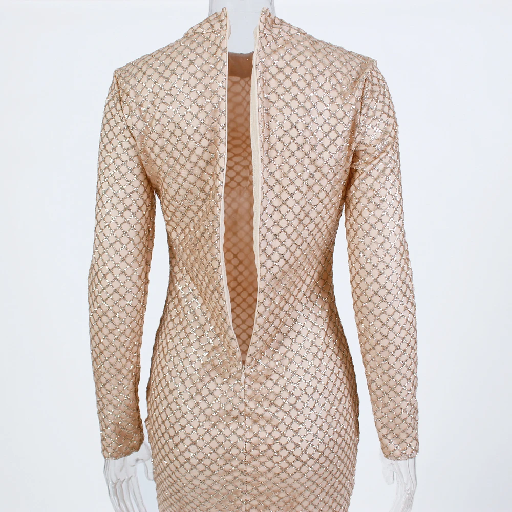 victoria’svogue 2021 Sexy Glittered Bodycon Party Mini Dress Full Sleeved Short Gold Plaid Glitters Dress O Neck Night Club Dress Spring