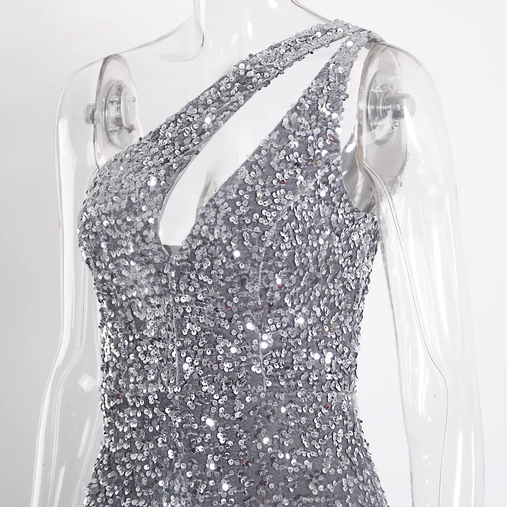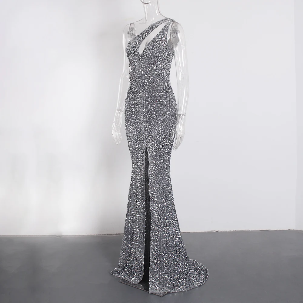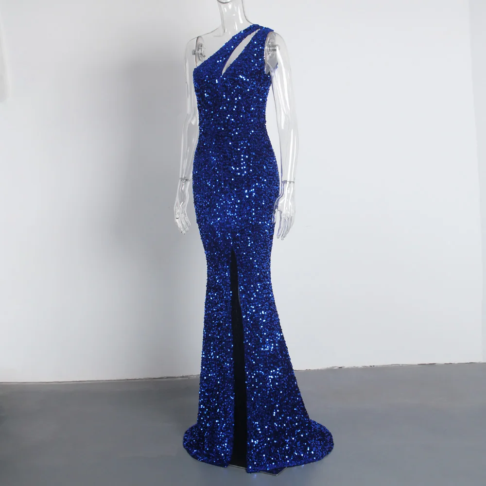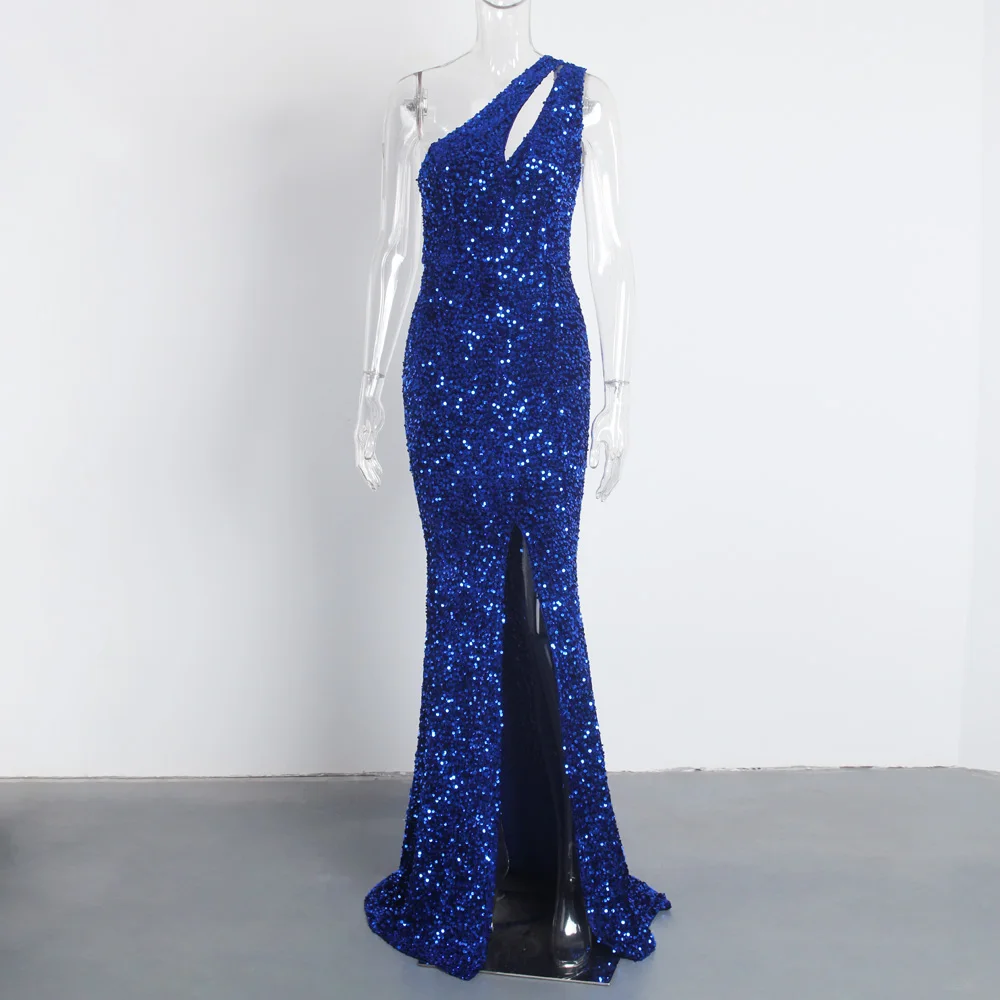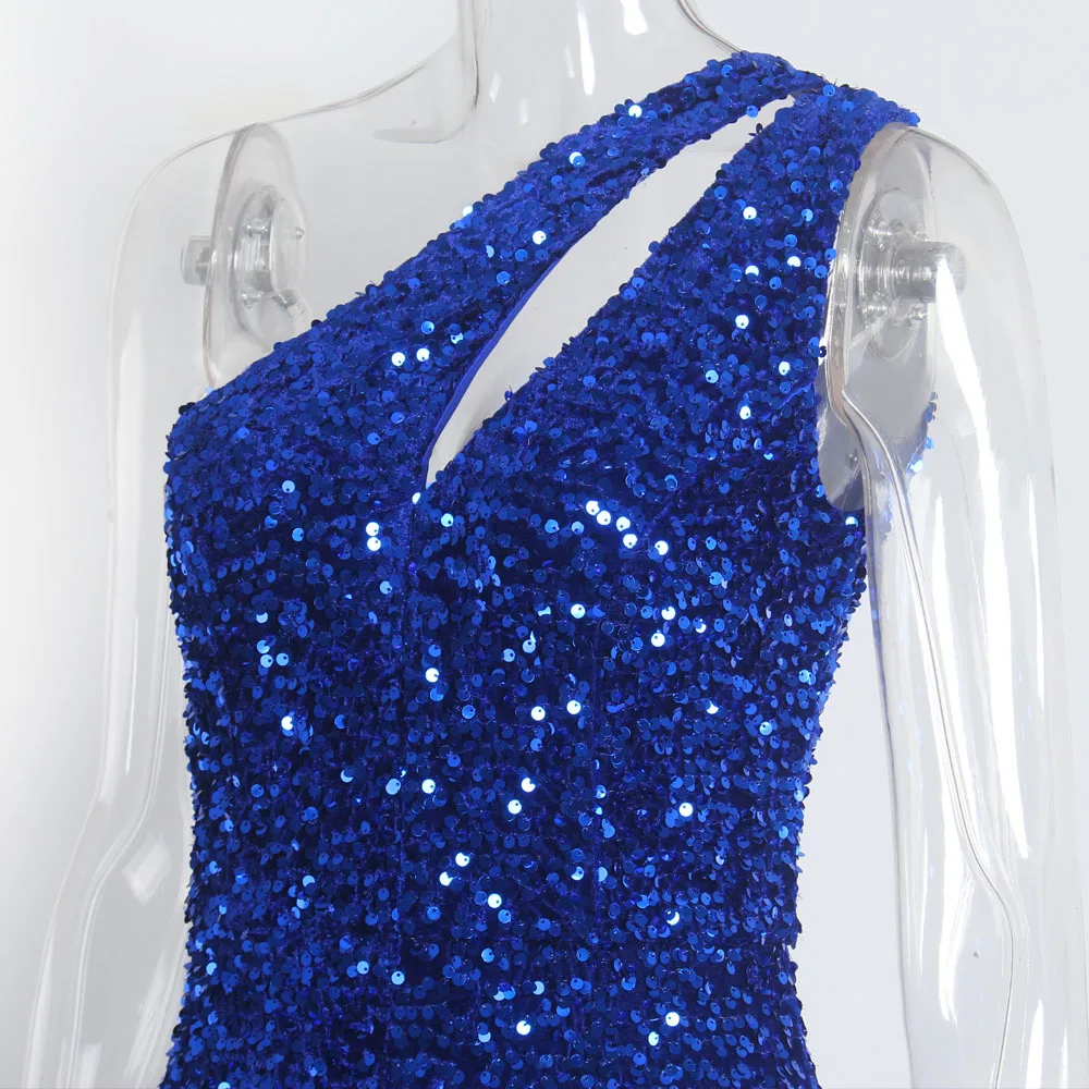 victori9a’svogue 2021 Sexy Hollow Out Grey One Shoulder Sequins Maxi Dress Stretch Split Sleeveless Floor Length Mermaid Formal Party Dress Blue