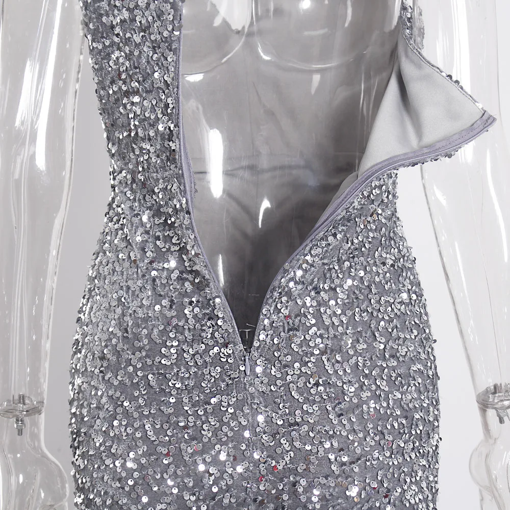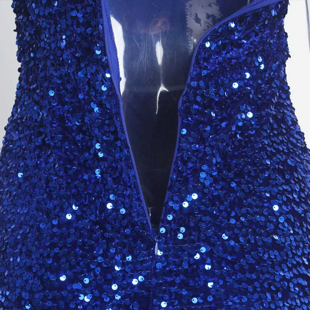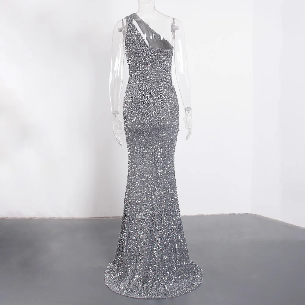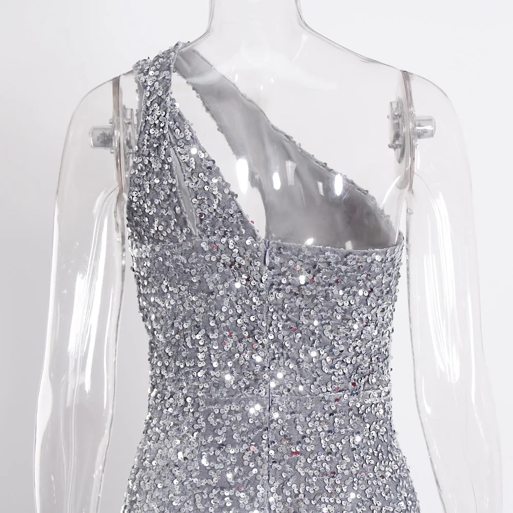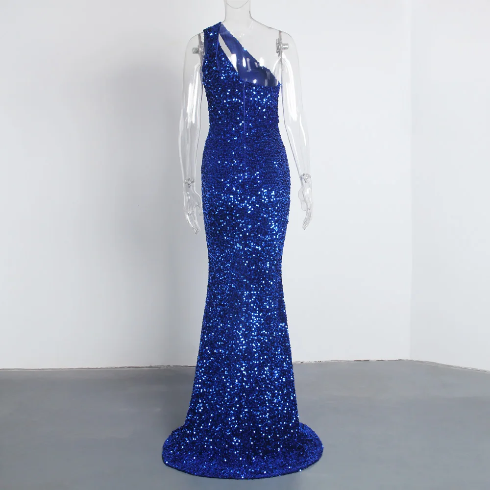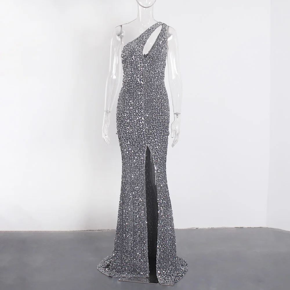 victori9a’svogue 2021 Sexy Hollow Out Grey One Shoulder Sequins Maxi Dress Stretch Split Sleeveless Floor Length Mermaid Formal Party Dress Blue