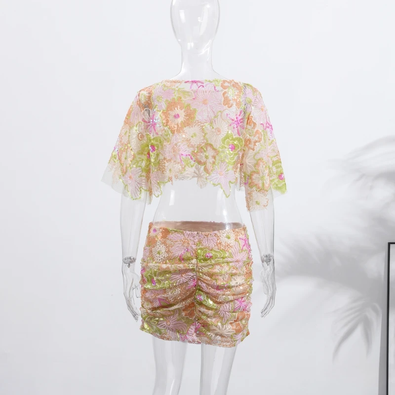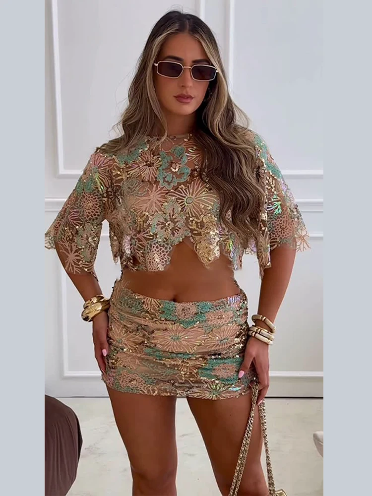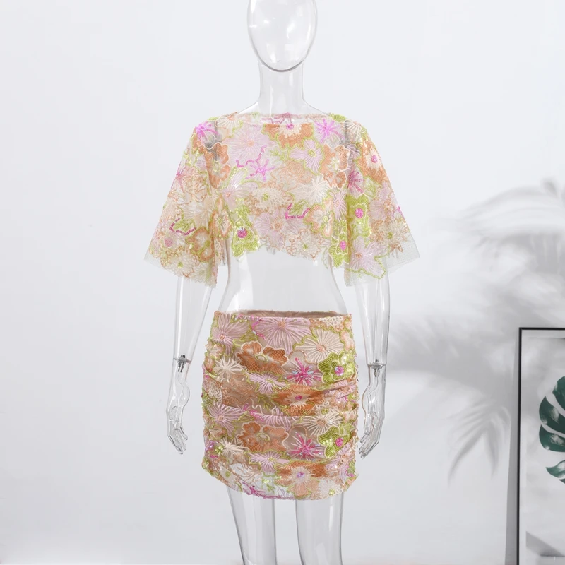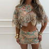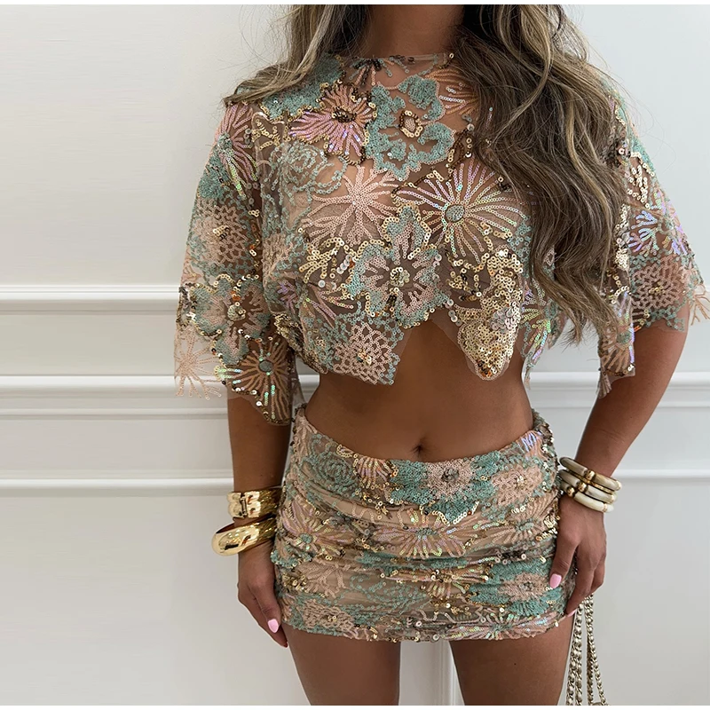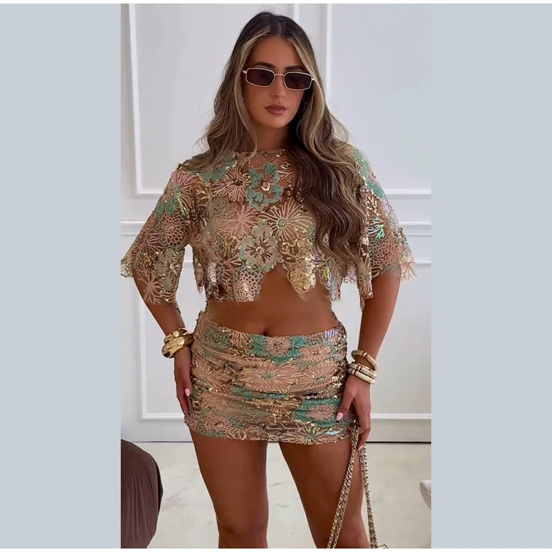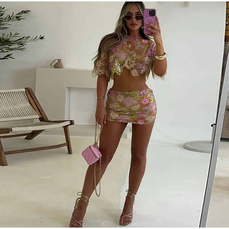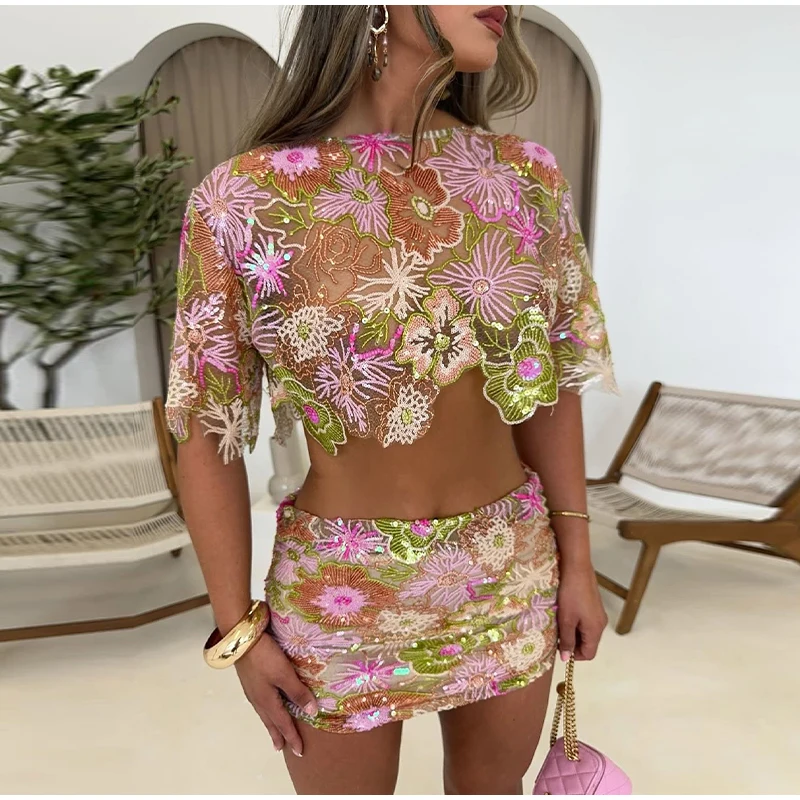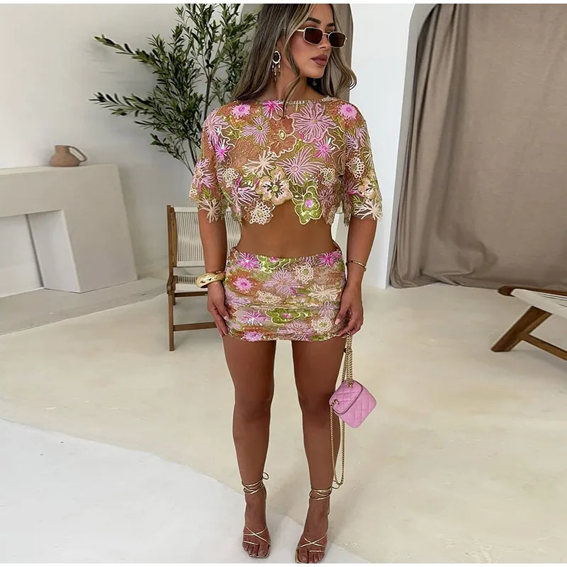 Victoria’s Vogue Sexy Lace Up Hallow Out Top Skirt Set Women Slim Half Sleeve O-neck Crop Tops Mini High Waist Skirts 2025 Summer Party Suit Lady