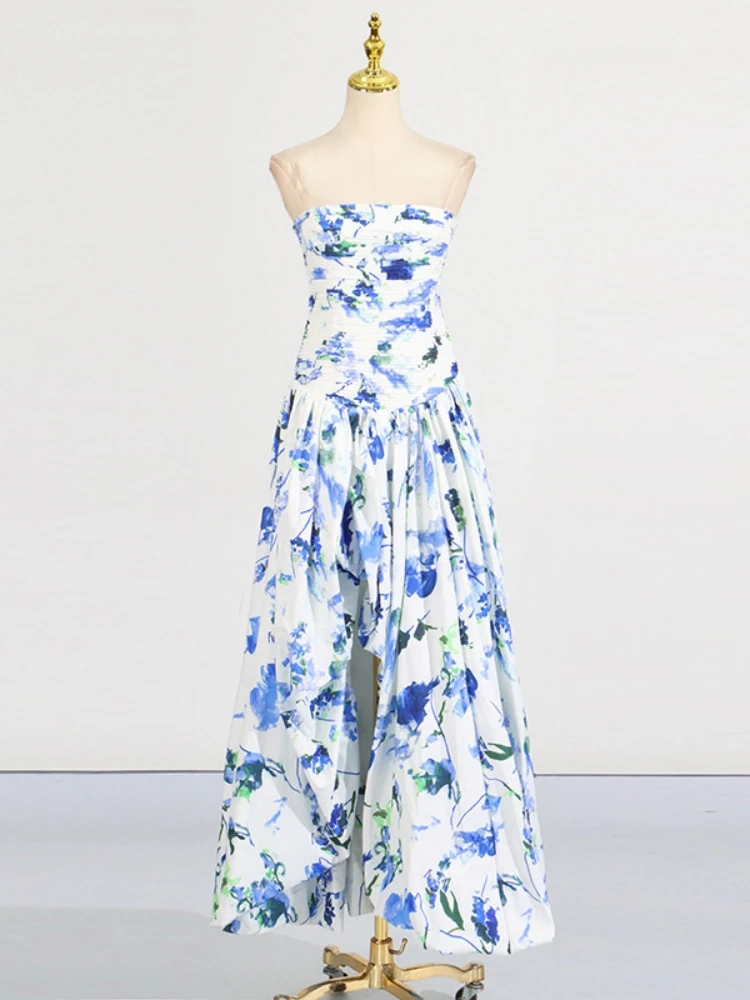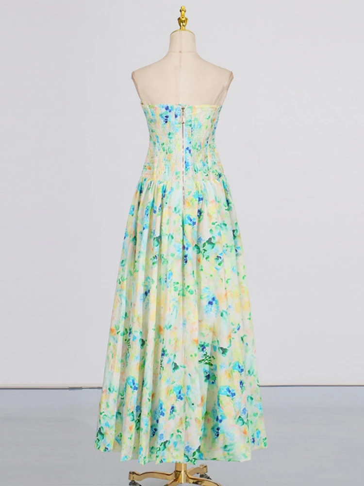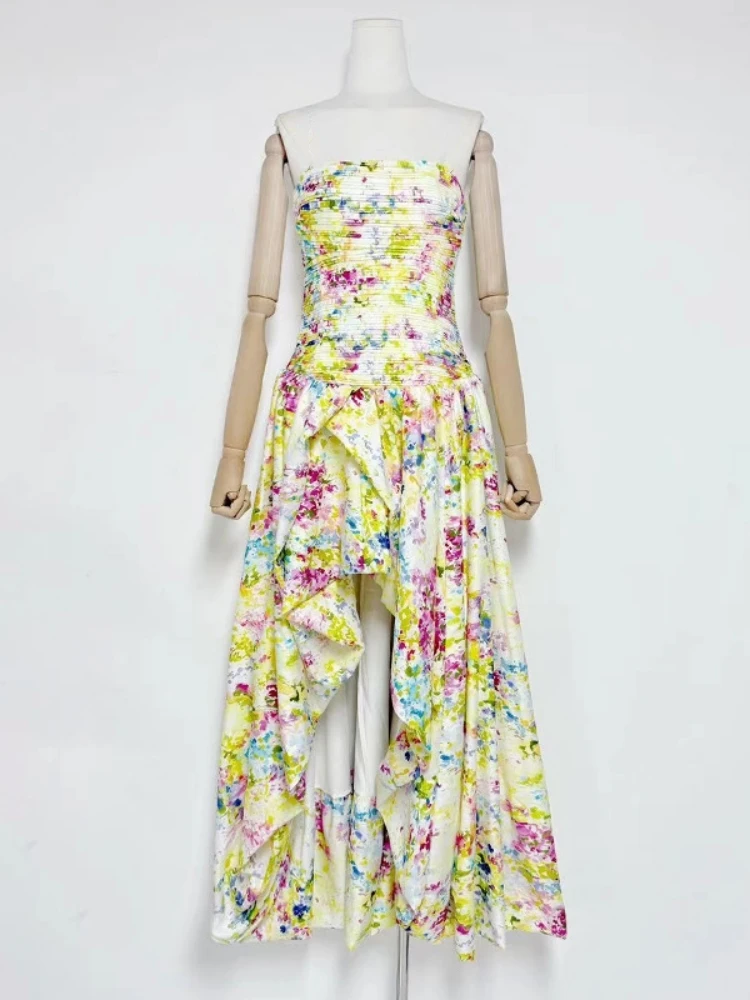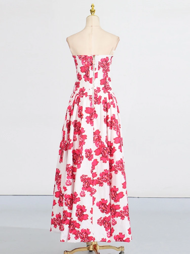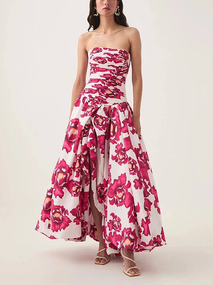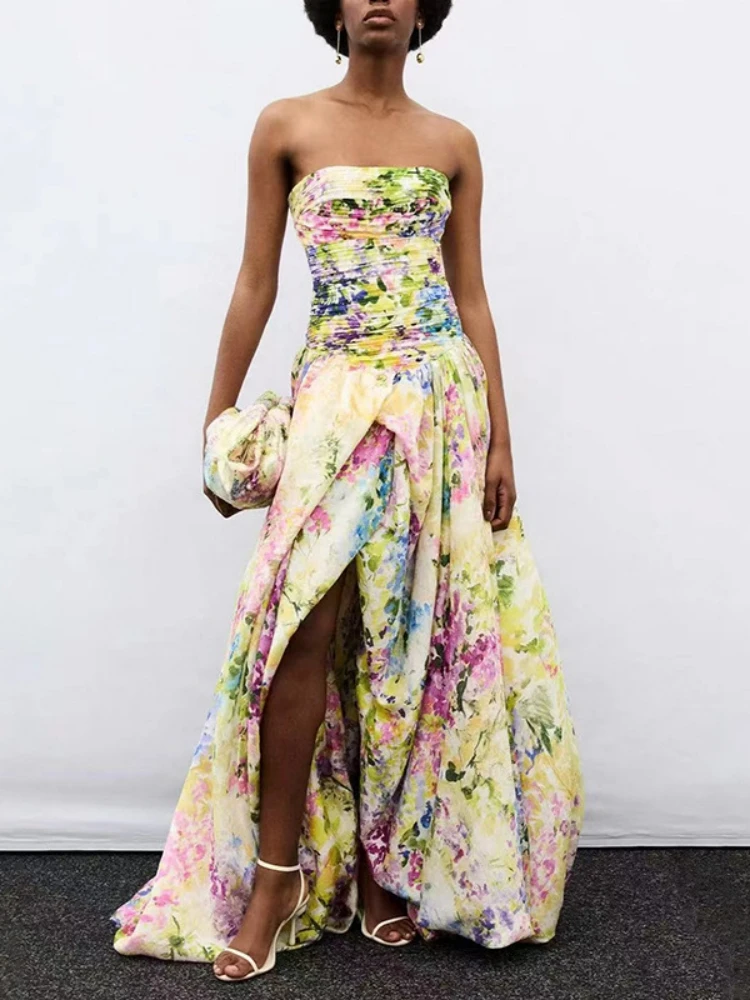 Victoria’s Vogue Strapless Printed Split Deign Long Bubble Dress Women Sleeveless Backless High Waist Patchwork Folds Dresses Evening Party