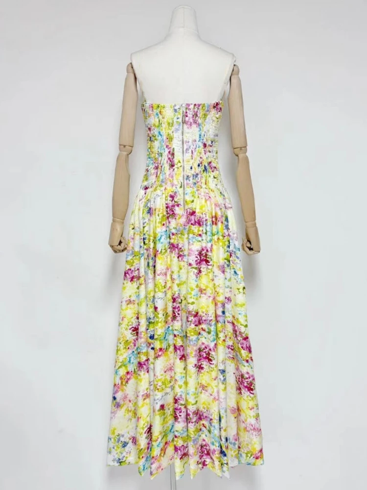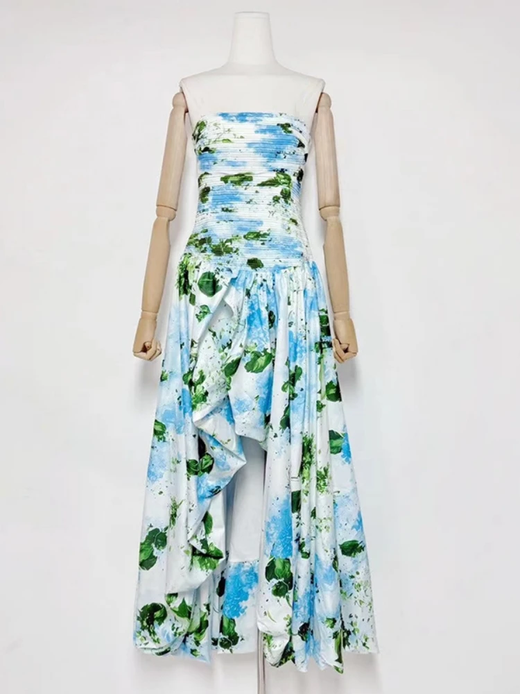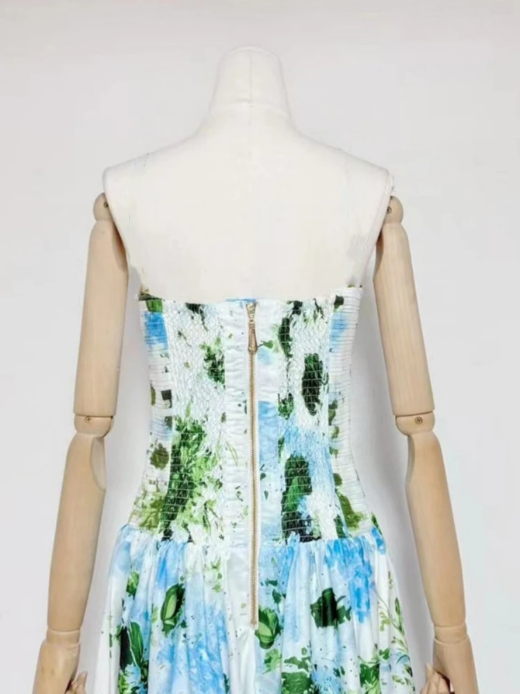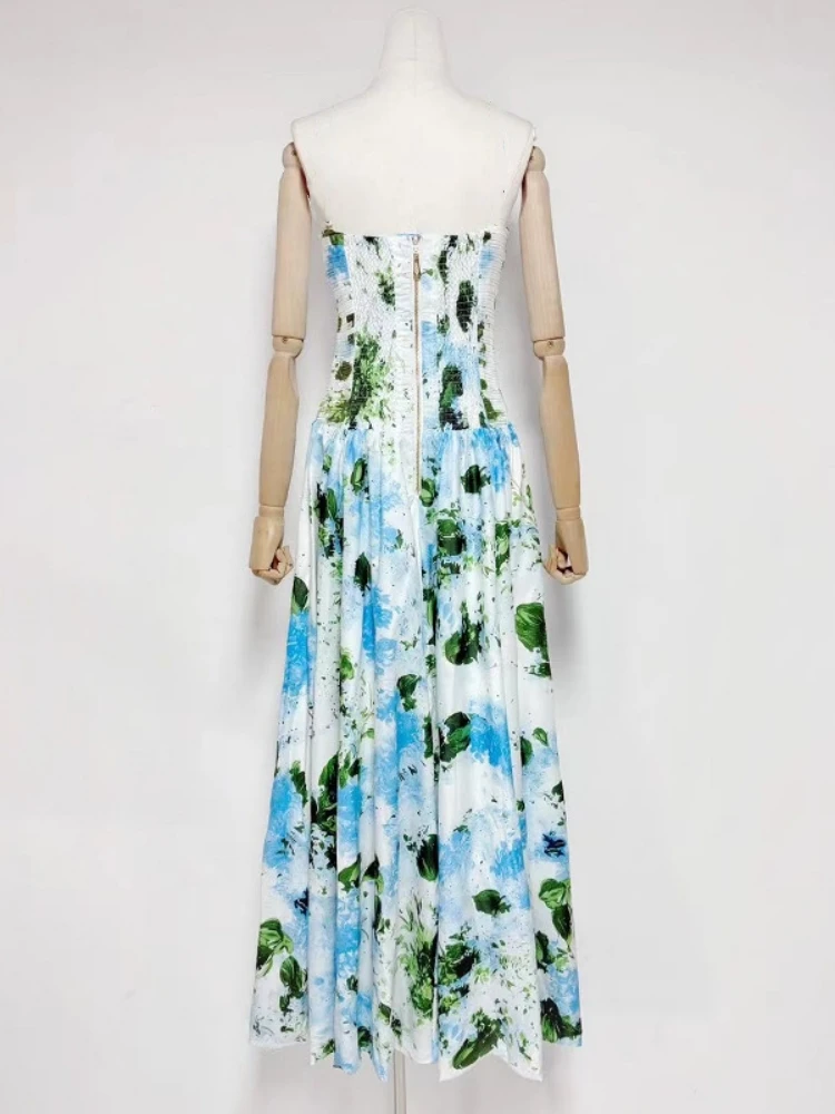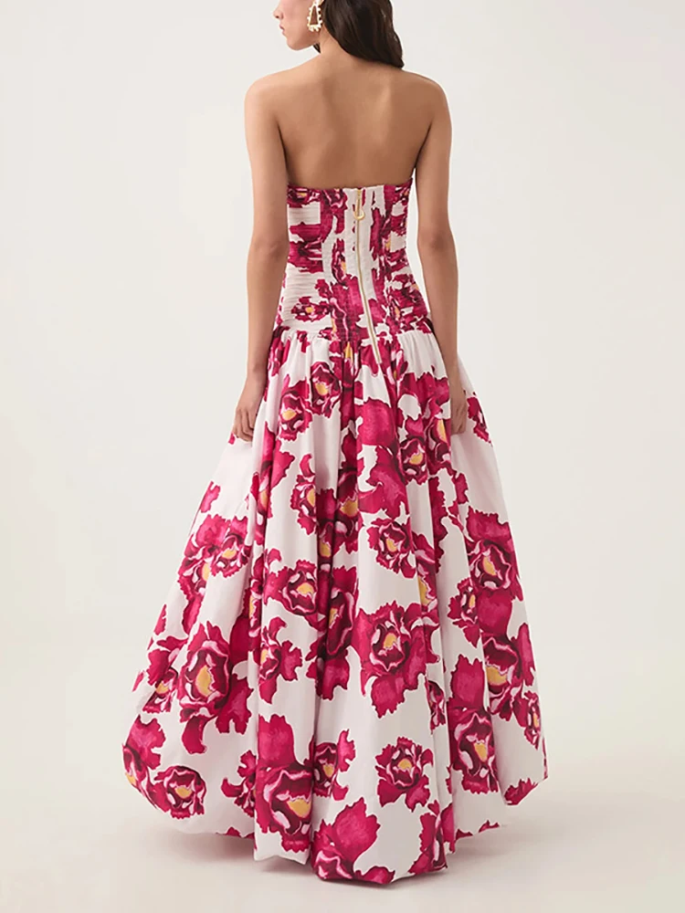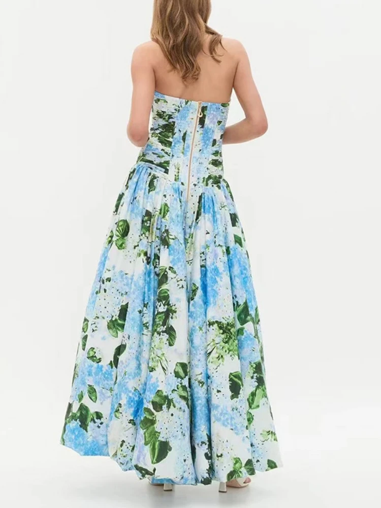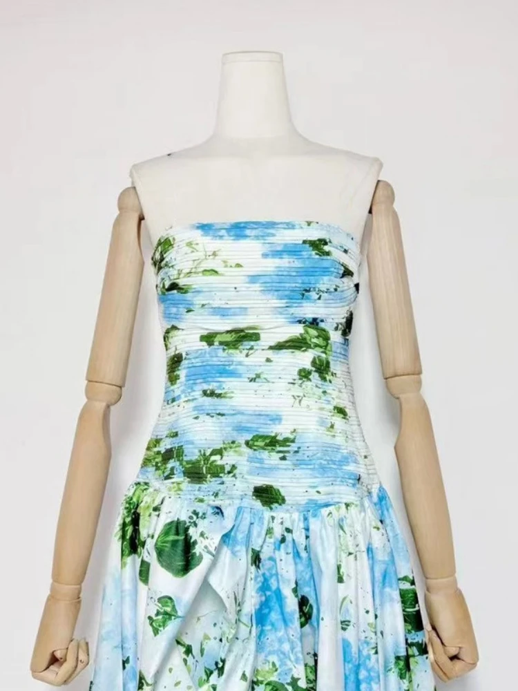 Victoria’s Vogue Strapless Printed Split Deign Long Bubble Dress Women Sleeveless Backless High Waist Patchwork Folds Dresses Evening Party