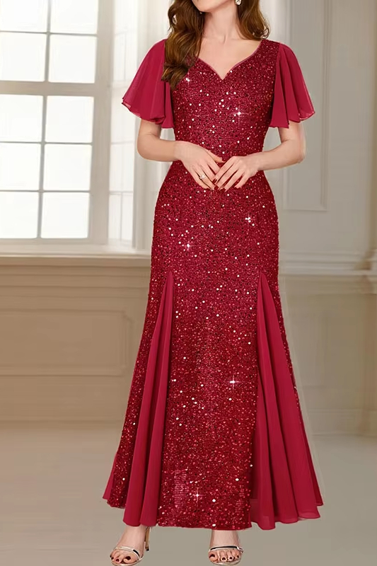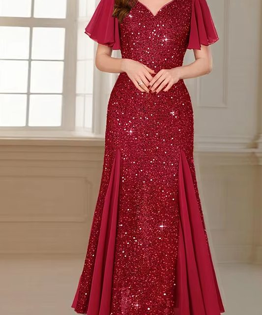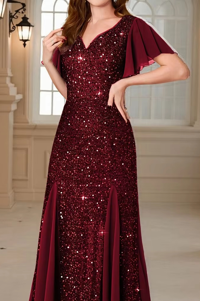Victoria’s Vogue Shiny Sequin Short Sleeved Women’s Party Dress Sexy V-neck High Waist Spliced Long Dress 2025 Elegant Solid Color Banquet Dress