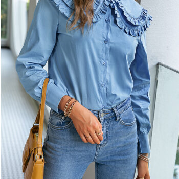 victoria’s vogue Office lady ruffle blouse shirt spring summer Solid button up long sleeve shirt Casual fashion blue soft lady tops 2022