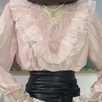 Victoria’s Vogue Luxury Beaded Sequined Stitch Lace White Black Pink Sexy Blouses Shirts For Women’s 2024 Spring Summer Long Sleeve Tops Blusas
