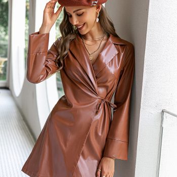 victoria’s vogue Office pu leather v-neck long sleeves lace up mini dress women A-line blazer collar autumn dresses Vintage solid vestido